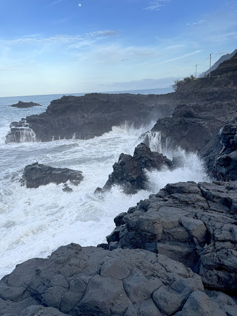 Było coś dla duszy, to czas na jakiś rarytas dla ciała, więc zachodzimy do miejscowej knajpy i zamawiamy Picado Maderiense – to typowo maderska potrawa, którą tworzą drobno posiekane kawałki mięsa głównie wołowego, smażonego z cebulą, papryką i przyprawami podawana z ziemniakami, frytkami lub ryżem. Przed nami jeszcze jeden punkt tego dnia. Jeszcze raz zjeżdżamy do Porto da Cruz, aby przespacerować się tamtejszą promenadą kawałkiem wybrzeża. Obserwujemy tu fale roztrzaskujące się o brzeg i powoli zmierzamy do samochodu.